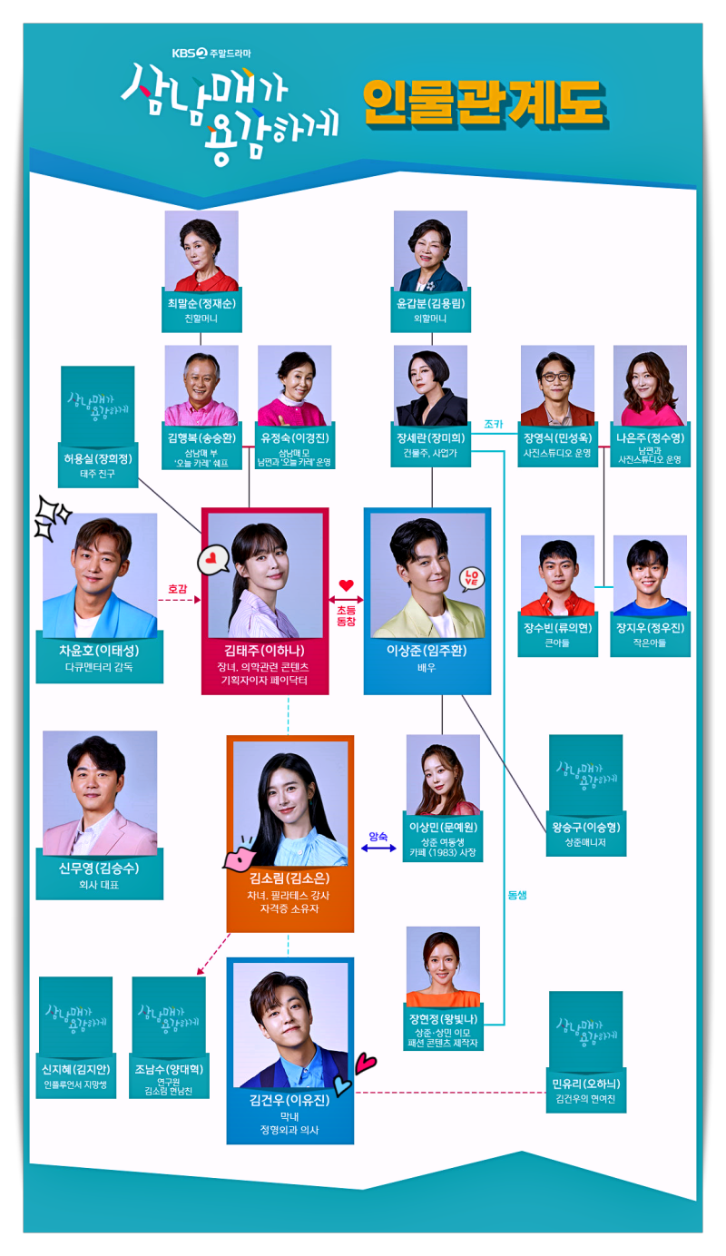 안녕하세요. 오늘은 드라마 현재는 아름다워 후속으로 방영 예정인 주말드라마 삼남매가 용감하게를 소개드리려고 합니다. KBS2에서 편성된 이번 드라마는 K-장녀로 가족을 위해 양보하고 성숙해야 했던 큰딸, 연예계 톱스타로 가족을 부양해야 했던 K-장남, 두 사람이 만나 행복을 찾아 나선 한국형 가족의 '사랑과 전쟁' 이야기 입니다. 50부작을 예정으로 이하나, 임주환, 김승수, 왕빛나, 이태성, 김소은, 이유진, 정재순, 송승환, 이경진 등 대배우님들이 대거 출연하십니다.