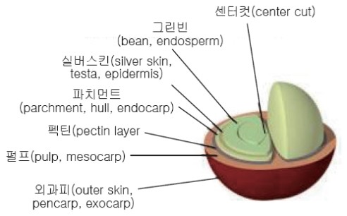 위 그림은 커피 열매의 구조에 대한 그림이다. 꼭 외워야 하는 사항이기에 네이버 지식백과를 참고하여 가지고 왔다.