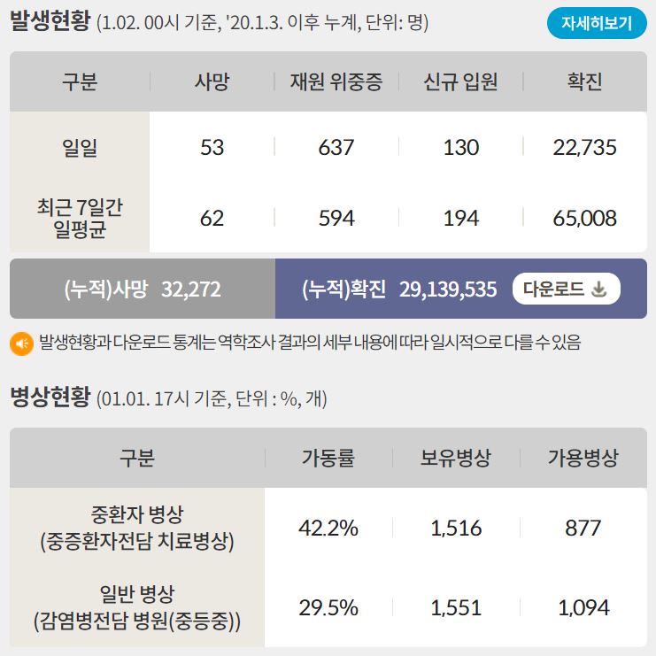 국내 지역감염 사례는 2만2700명이며, 위중증 환자는 637명으로 전날(636명)보다 1명 증가했습니다. 전날 코로나19로 사망한 환자는 53명으로 직전일(63명)보다 10명 감소했습니다. 누적 사망자는 총 3만2272명, 누적 치명률은 0.11%입니다.