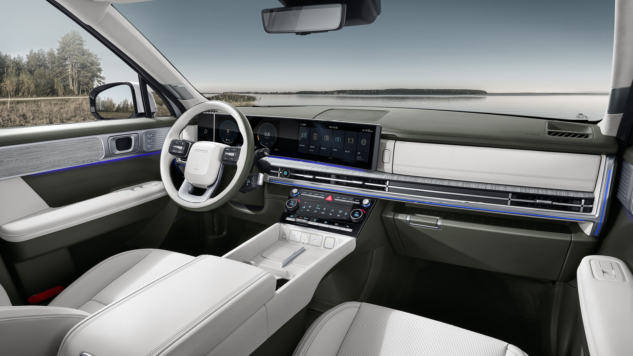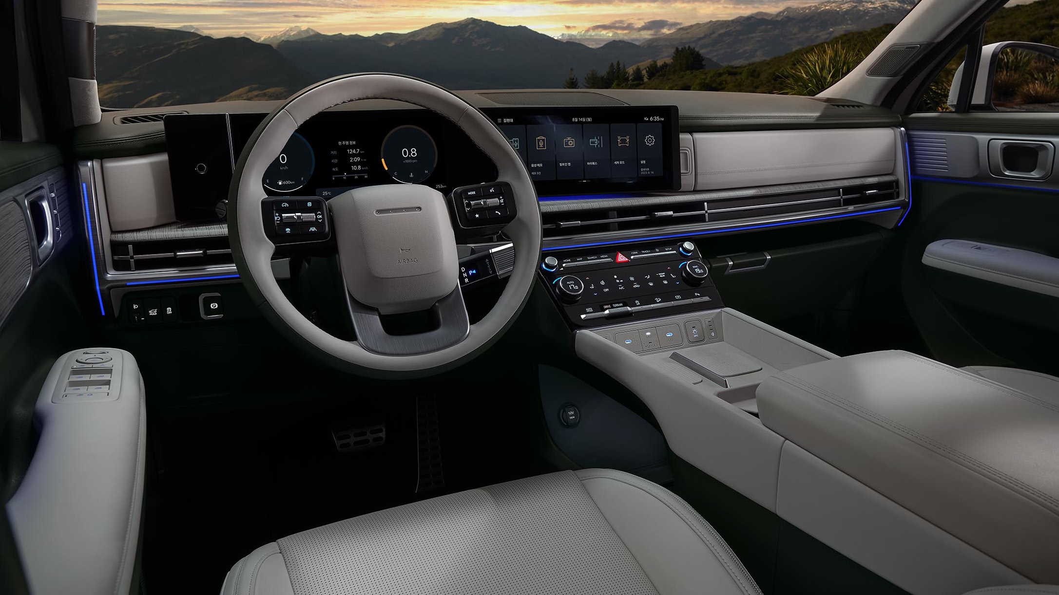 이번 새로 공개된 싼타페는 외부 뿐 만 아니라 내부또한 대형 SUV 답게 시원한 인테리어로 개방감을 더했으며 전방에 위치해있는 일체형 디스플레이는 운전석 방향으로 약간 휘어진 커브드 방식을 선택해 주행 중에도 넓은 시야를 확보 할 수 있도록 했다.